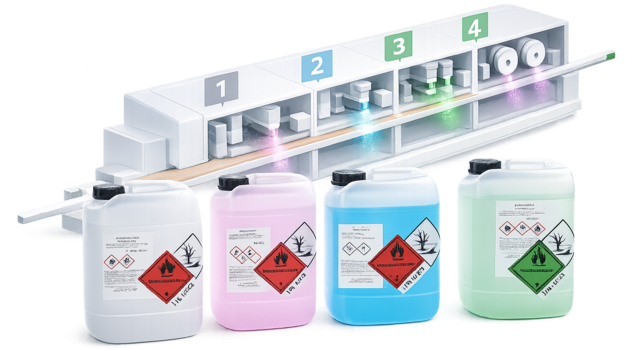 The finished edged panel should leave the machine clean and free of residues. Therefore, a cleaner is sprayed on before the polishing discs. We supply the following products for this purpose: